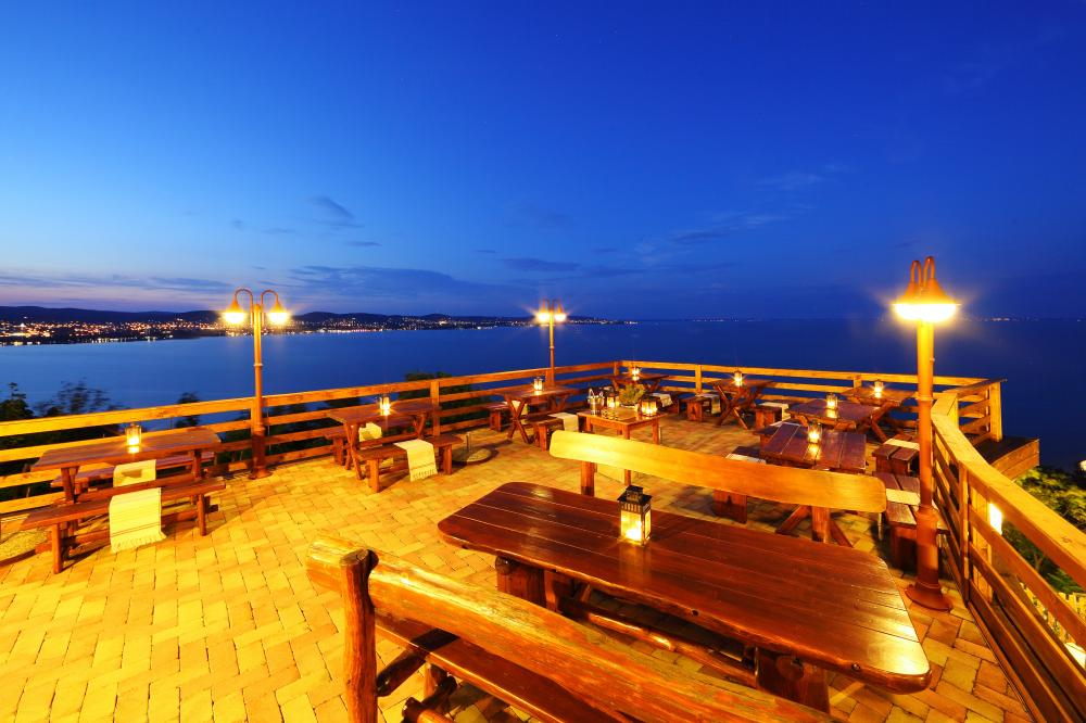 Egyedi elhelyezkedése miatt páratlan, mint egy 240 fokos kilátás nyílik a Balaton keleti medencéjére és a Tihanyi Apátság impozáns épületére. Teraszunkon ülve vendégeink a nap bármely szakában gyönyörködhetnek a megunhatatlan balatoni panorámában. Ideális gasztronómiai célpontja lehet a kreatív meglepetéseknek, tökéletes választás itt egy korai esti randevú a naplementében.